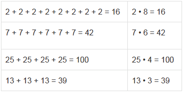 2 + 2 + 2 + 2 + 2 + 2 + 2 + 2      2 • 8 =