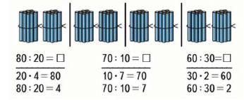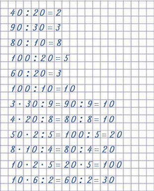 | 40 : 20 = 2 90 : 30 = 3 80 : 10 = 8 | 3 • 30 : 9 = 10 4 • 20 : 8 = 10 50 • 2 : 5 = 20 |