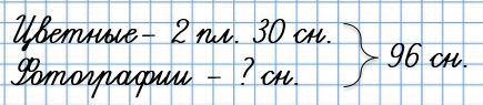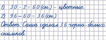 4. За время каникул Саша сделал 96 фотоснимков. Он отснял две цветные плёнки, по 30 снимков на каждой, и несколько фотографий на смартфон. Сколько фотографий на смартфон сделал Саша?