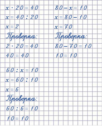 | х • 20 = 40 х = 40 : 20 х = 2 Проверка: 2 • 20 = 40 40 = 40 | 80 - х = 10 х = 80 - 10 х = 70 Проверка: 80 - 70 = 10 10 = 10 | 60 : х = 10 х = 60 : 10 х = 6 Проверка: 60 : 6 = 10 10 = 10 |