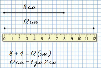 5. Начерти один отрезок длиной 8 см, а другой — на 4 см больше. Вырази длину второго отрезка в дециметрах и сантиметрах.