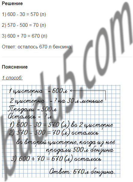 15. В одной цистерне было 600 л бензина, в другой - на 30 л меньше. За день продали 500 л бензина. Сколько всего литров бензина осталось в этих цистернах?
