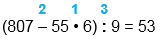 (807 - 55 • 6) : 9 = 53