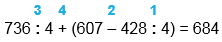 | 736 : 4 + (607 - 428 : 4) = 684 | |||||||||||||||