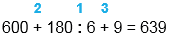 600 + 180 : 6 + 9 = 639