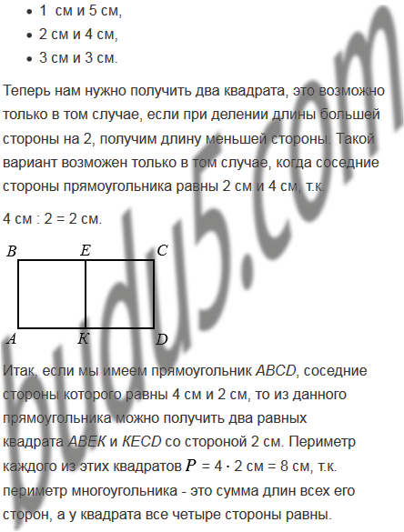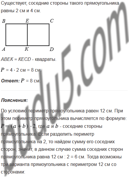Существует ли среди прямоугольников с периметром 12 см такой, который можно разделить на два равных квадрата? В случае положительного ответа выполните рисунок и вычислите периметр каждого из полученных квадратов.