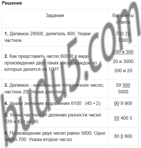 | 1. Делимое 28000, делитель 400. Укажи частное. | 700 70 7000 |