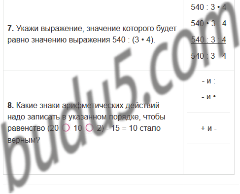| 7. Укажи выражение, значение которого будет равно значению выражения 540 : (3 • 4). | 540 : 3 • 4 540 • 3 : 4 540 : 3 : 4 540 : 3 - 4 |