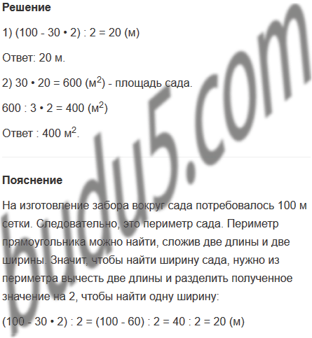 25. Длина сада прямоугольной формы 30 м. На изготовление забора вокруг сада потребовалось 100 м сетки.