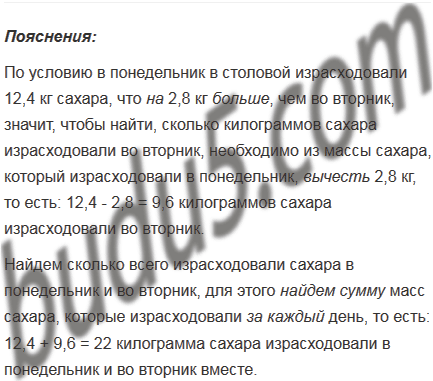 В понедельник в столовой израсходовали 12,4 кг сахара, что на 2,8 кг больше, чем во вторник. В среду сахара было израсходовано на 5,6 кг меньше, чем в понедельник и во вторник вместе. Сколько всего килограммов сахара израсходовали в понедельник, вторник и среду?