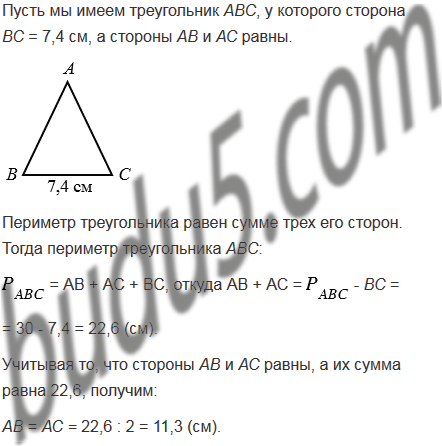 Периметр треугольника равен 30 см, одна из его сторон - 7,4 см, а две другие стороны равны между собой. Найдите длины равных сторон.