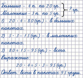 3. В четырёх больших пакетах лежат груши, по 20 в каждом, а в трёх маленьких пакетах - по 5 груш в каждом. Сколько всего груш ... ?