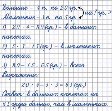 Ответ: на 65 груш в больших пакетах больше, чем в маленьких.