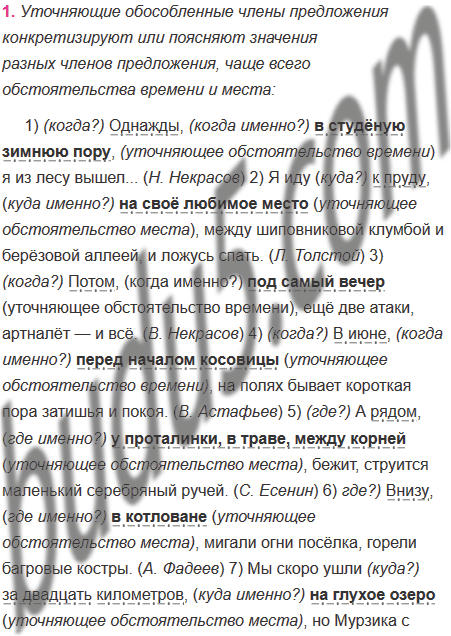 1. Выразительно прочитайте, соблюдая интонацию обособления. Объясните, в чём состоит смысловая роль уточняющих членов в каждом примере. Сделайте вывод.