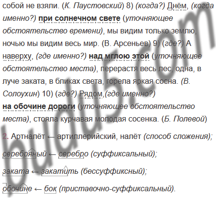 1) Однажды, в студёную зимнюю пору, я из лесу вышел... (Н. Некрасов) 2) Я иду к пруду, на своё любимое место, между шиповниковой клумбой и берёзовой аллеей, и ложусь спать. (Л. Толстой) 3) Потом, под самый вечер, ещё две атаки, артналёт — и всё. (В. Некрасов) 4) В июне, перед началом косовицы, на полях бывает короткая пора затишья и покоя. (В. Астафьев) 5) А рядом, у проталинки, в траве, между корней, бежит, струится маленький серебряный ручей. (С. Есенин) 6) Внизу, в котловане, мигали огни посёлка, горели багровые костры. (А. Фадеев) 7) Мы скоро ушли за двадцать километров, на глухое озеро, но Мурзика с собой не взяли. (К. Паустовский) 8) Днём, при солнечном свете, мы видим только землю, ночью мы видим весь мир. (В. Арсеньев) 9) А наверху, над мглою этой, перерастя весь лес, одна, в луче заката, в бликах света, горела яркая сосна. (В. Солоухин) 10) Рядом, на обочине дороги, стояла курчавая молодая сосенка. (Б. Полевой)