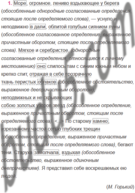 1. Спишите текст, устно объясняя постановку знаков препинания при обособлении второстепенных членов предложения.