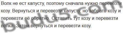 Некий человек должен был перевезти в лодке через реку волка, козу и капусту. В лодке мог поместиться один человек, а с ним или волк, или коза, или капуста. Но если оставить волка с козой без человека, то волк съест козу. Если оставить козу с капустой, то коза съест капусту. А в присутствии человека "никто никого не ел". Человек всё-таки перевёз свой груз через реку. Как он это сделал?