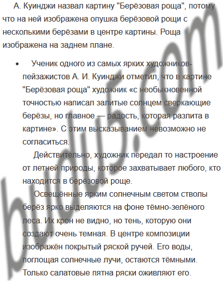 Один из учеников А. Куинджи сказал: «В пейзаже «Берёзовая роща» Архип Иванович с необыкновенной точностью написал залитые солнцем сверкающие берёзы, но главное — радость, которая разлита в картине». Согласны ли вы с этим высказыванием? Какое впечатление о картине сложилось у вас? Напишите об этом. В ответе можно использовать слова и словосочетания: яркий солнечный свет, зеленая поляна, бело-розовые стволы, на фоне тёмно-зелёного леса, ручей, покрытый ряской.