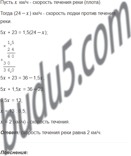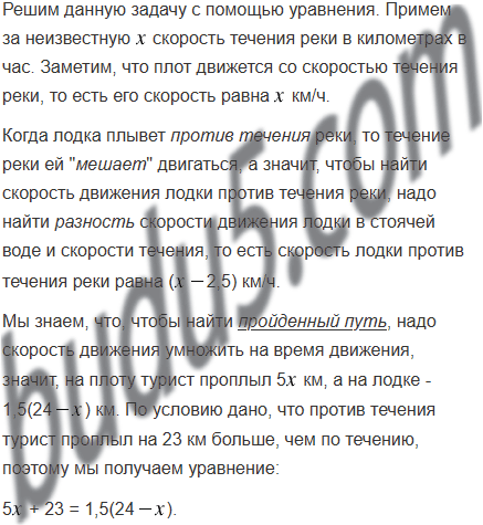Турист плыл 5 ч на плоту по течению реки и 1,5 ч на моторной лодке против течения. Скорость лодки в стоячей воде равна 24 км/ч. Найдите скорость течения, если против течения турист проплыл на 23 км больше, чем по течению.