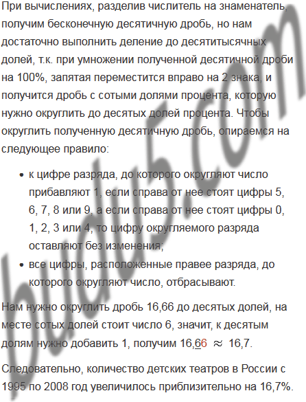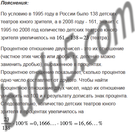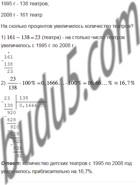 На сколько процентов увеличилось в России количество детских театров юного зрителя с 1995 по 2008 год, если в 1995 году таких театров было 138, а в 2008 году - 161? Ответ округлите до десятых процента.