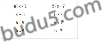 | а) k увеличить в 5 раз; k увеличить на 5; k уменьшить в 5 раз; k уменьшить на 5. | б) b уменьшить на 7; b увеличить в 7 раз; b увеличить на 7; b уменьшить в 7 раз. |