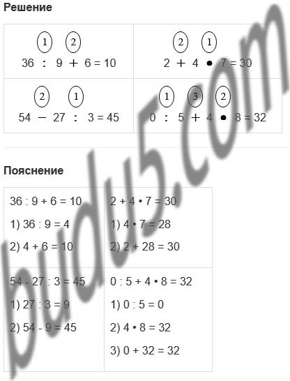 | 36 : 9 + 6 | 2 + 4 • 7 | 54 - 27 : 3 | 0 : 5 + 4 • 8 |