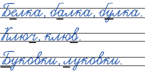 Объясним значения слов: белка - зверёк с пушистым хвостом; балка - брус, часть сооружения; булка - хлеб продолговатой формы; ключ - предмет для открывания двери; клюв - окончание рта у птиц; буковка - маленькая буква; луковка - небольшая луковица.