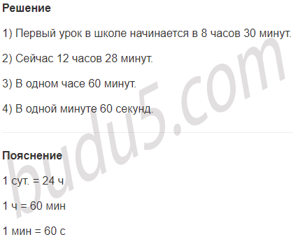 1) Первый урок в школе начинается в ... часов ... минут.