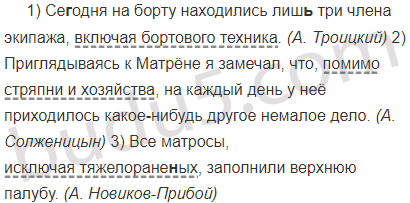 1) Се..одня на борту находились лиш(?) три члена экипажа включая бортового техника. (А. Троицкий) 2) Приглядываясь к Матрёне я зам..чал что помимо стряпни и хозяйства на каждый день у неё пр..ходилось какое(нибудь) другое (не)малое дело. (А. Солженицын) 3) Все матросы исключая тяжелоране(н, нн)ых заполнили верхнюю палубу. (А. Новиков-Прибой)