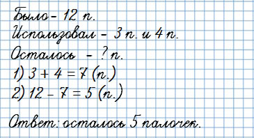 У Юры было 12 счетных палочек. Для решения примеров он использовал сначала 3, а потом еще 4 палочки.