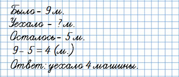 В гараже было 9 машин. Когда несколько машин уехало, в гараже осталось 5 машин.