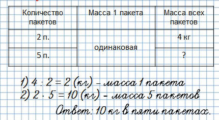 В двух одинаковых пакетах 4 кг муки. Сколько килограммов муки в пяти таких пакетах?